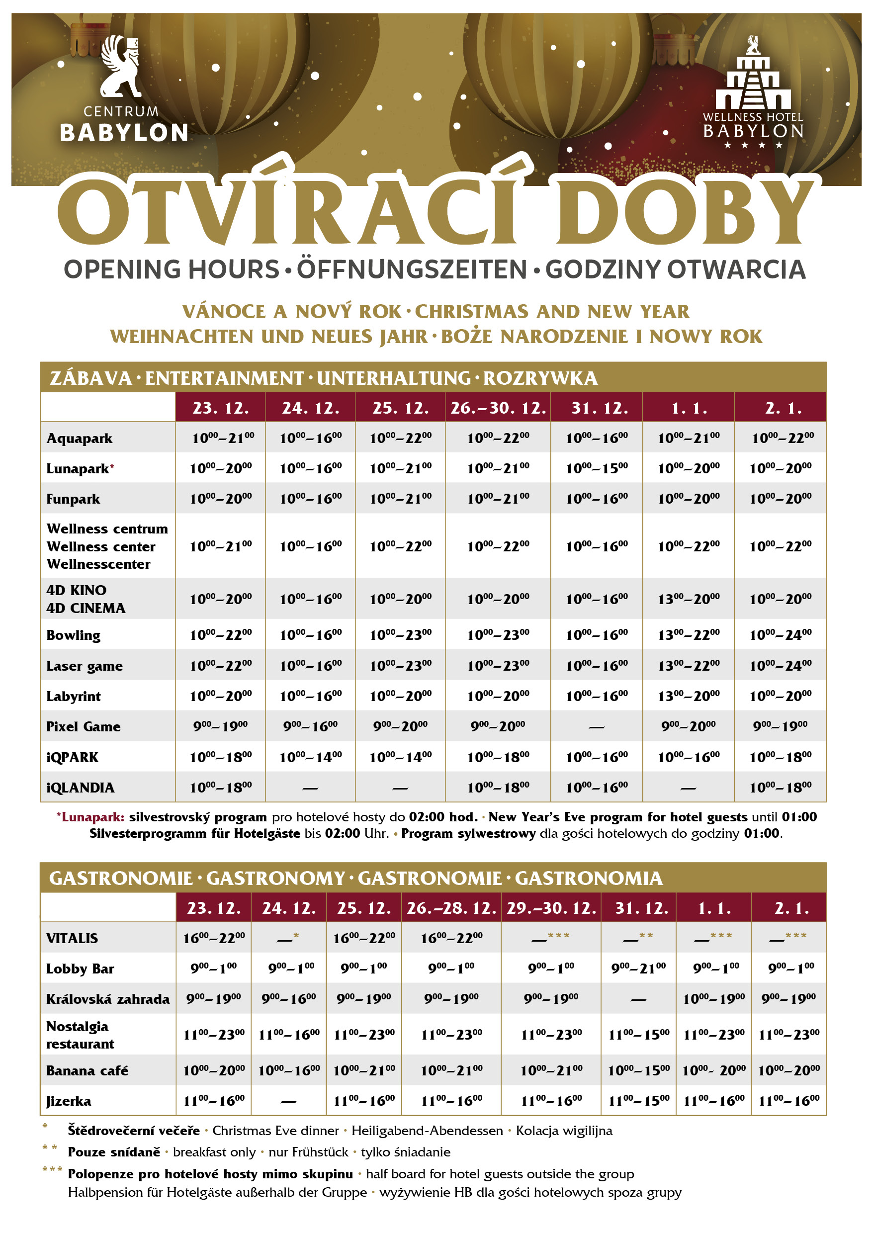 Vánoční svátky se blíží a s nimi i chvíle pohody, radosti a společných zážitků. Aby pro vás plánování návštěvy našeho hotelu bylo co nejpříjemnější, připravili jsme přehled otevírací doby všech našich provozů během vánočních dnů.