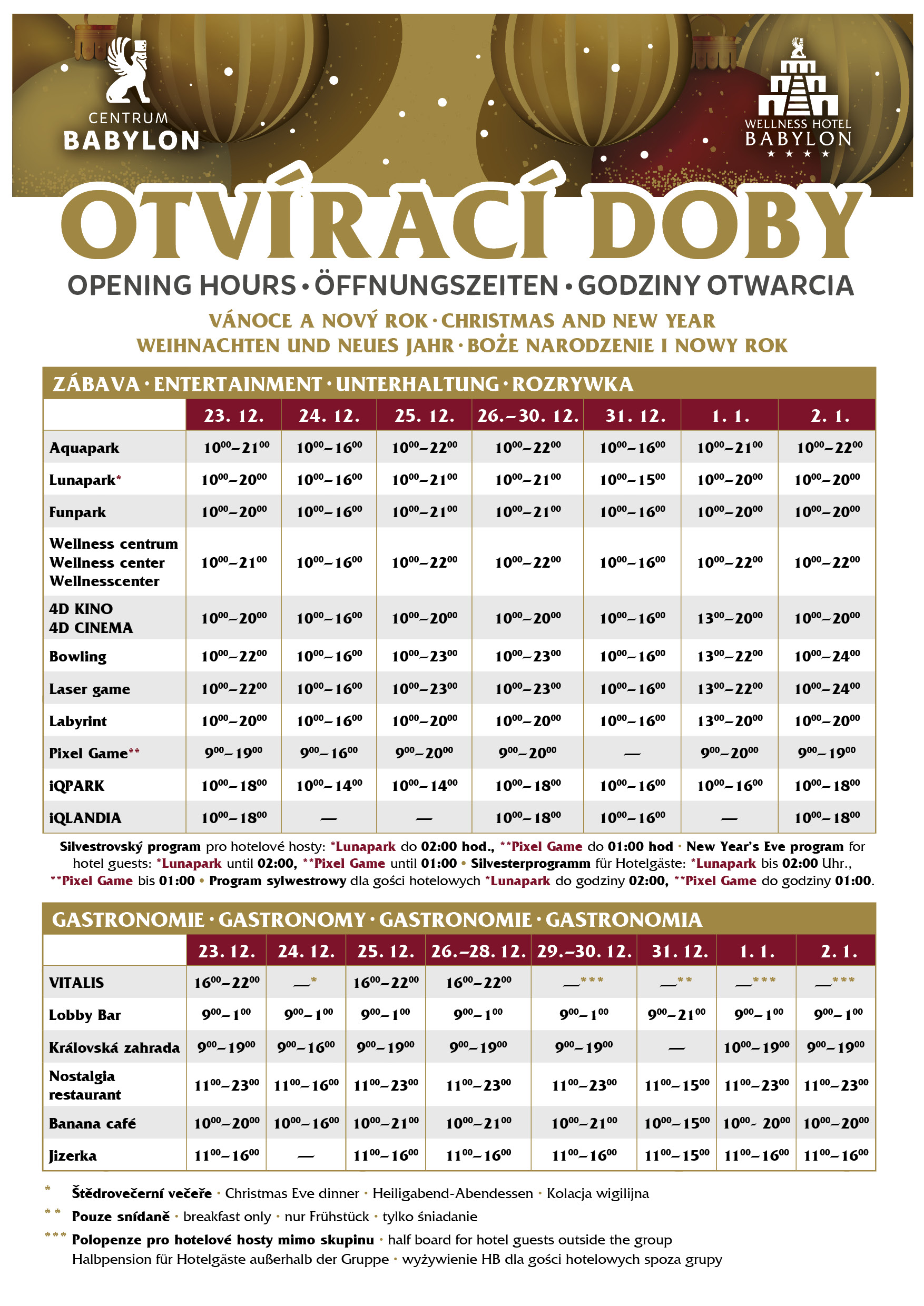 Vánoční svátky se blíží a s nimi i chvíle pohody, radosti a společných zážitků. Aby pro vás plánování návštěvy našeho hotelu bylo co nejpříjemnější, připravili jsme přehled otevírací doby všech našich provozů během vánočních dnů.